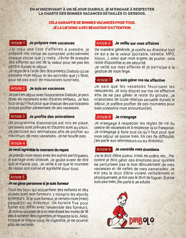 Chaque enfant et jeune inscrit en séjour DIABOLO s'engage à respecter les règles de vie de la colo et son fonctionnement global. Tout est résumé au sein de la Charte des bonnes vacances.