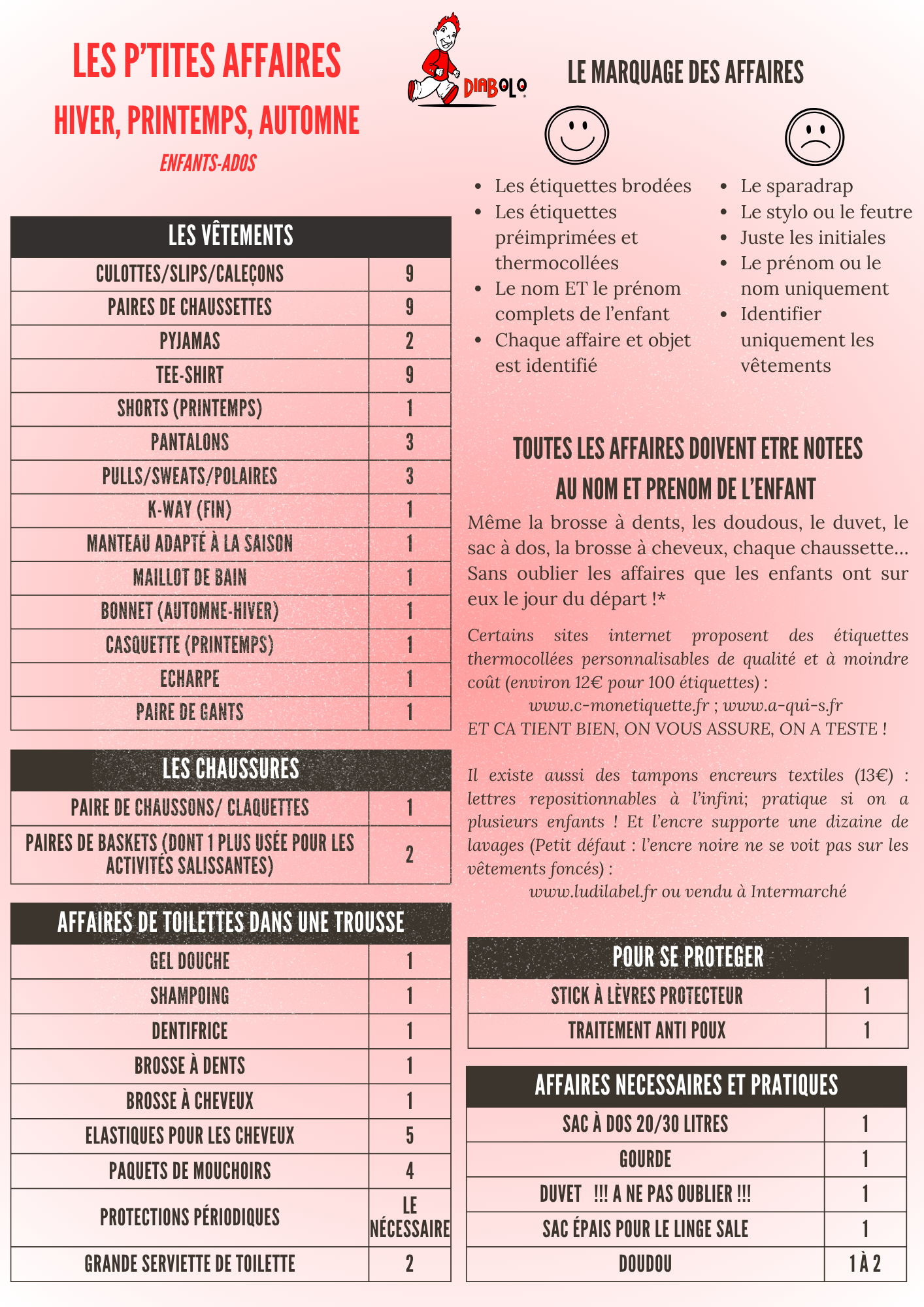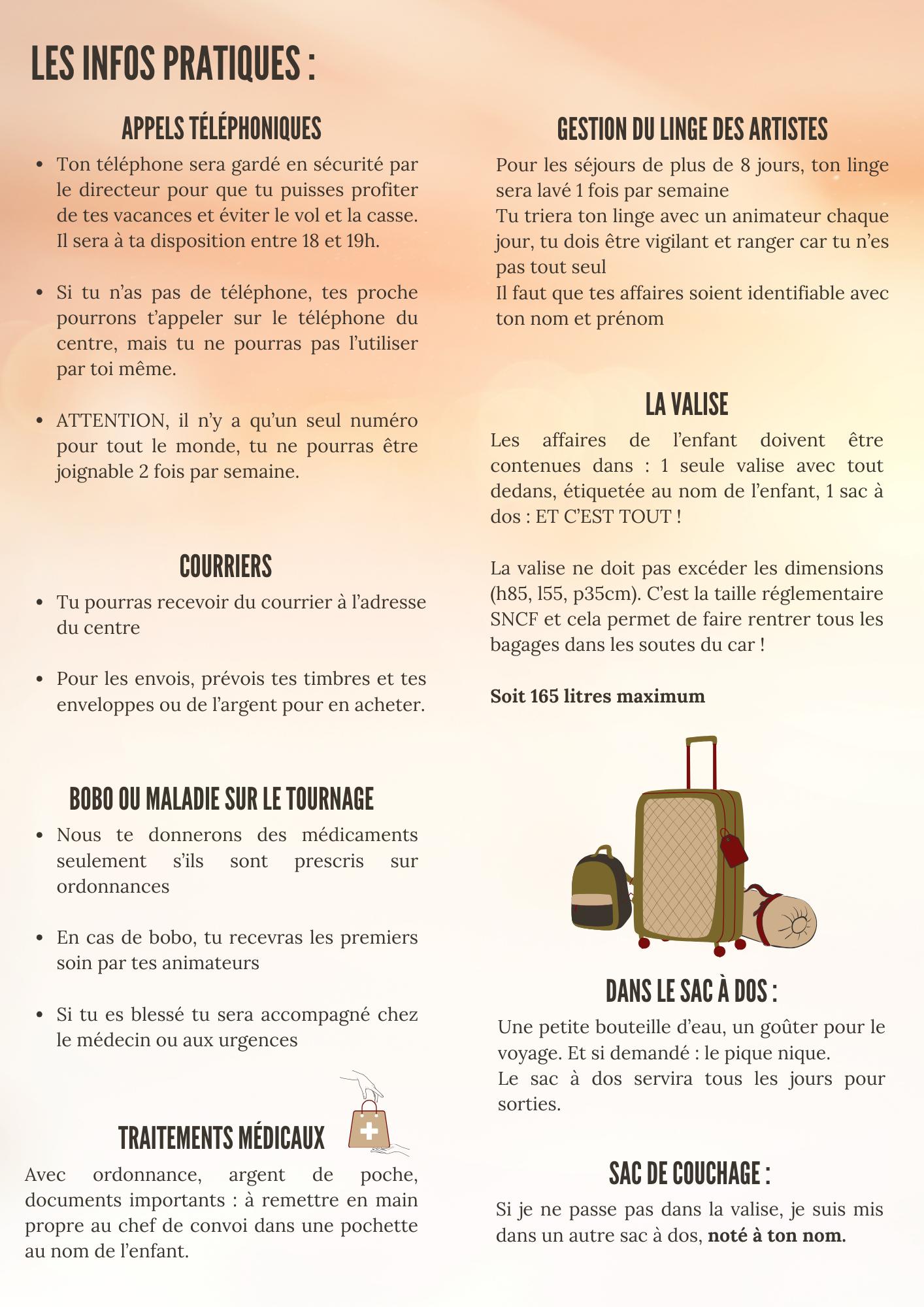 Vous trouverez toutes les infos concernants la gestion du téléphone portable, du linge, des contacts avec les familles, des petits bobos... au sein des P'tites infos.